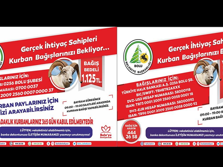 Bolu Belediyesi sosyal medya hesaplarından ve kentin bazı noktalarında bulunan billboardlara afişler asarak, vatandaşlardan kurban bağışlarını belediyeye ait olan aşevine yapmalarını istedi.