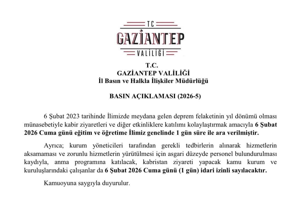 Kahramanmaraş merkezli 6 Şubat 2023 depremlerinin yıl dönümü dolayısıyla Gaziantep'te anma programları ve kabir ziyaretleri için düzenleme yapıldı. Valilikten yapılan açıklamada, vatandaşların ve öğrencilerin etkinliklere katılımını kolaylaştırmak amacıyla 6 Şubat 2026 Cuma günü okulların tatil edildiği bildirildi.