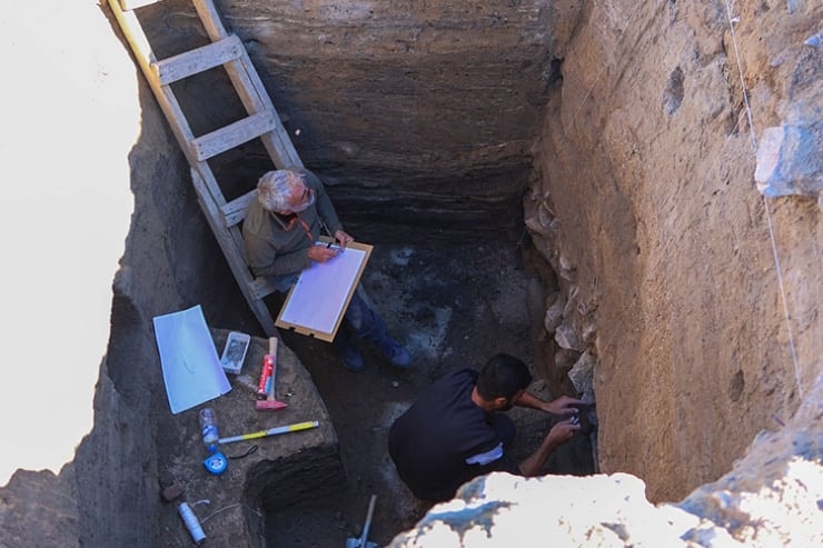 "Mutfak bölümünün yanında yer alan ve daha önce izinsiz kazlarla açılmış olan alanda yürütülen temizlik ve sondaj kazısında biraz daha derine inildi, orada da sondaj kesitinde taş temel üzerine kerpiçle devam eden bir duvar olduğunu gördük."