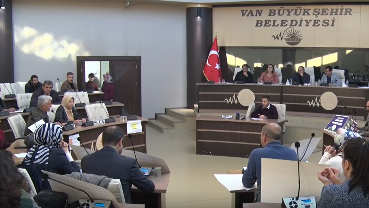 Van Büyükşehir Belediyesi Meclisi'nde Bahçesaray Belediye Başkanlığına kayyum atanmasına tepki gösterildi. DEM Parti Grubu, kayyumu protesto eden dövizlerle Meclis toplantısına katıldı. AKP'li meclis üyeleri toplantı salonunu terk etti.