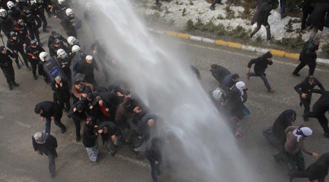 Van’da güvenlik güçleri ile PKK’lılar arasında dün çıkan çatışmayı protesto etmek isteyen gruba polis müdahale etti. Tazyikli suyla gruba müdahale eden polisler çok sayıda göstericiyi gözaltına aldı.