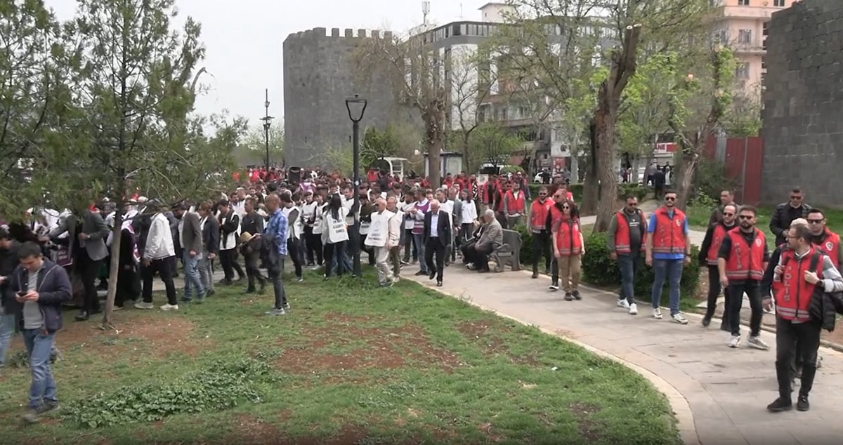 Önceki gün Diyarbakır’daki Dağkapı Meydanı’nda toplanan binlerce kişi, teröristbaşı Öcalan’ın 77 yıl önce doğduğu Şanlıurfa’nın Ömerli köyüne yürüyüş düzenledi. Kırmızı yelekli yüzlerce polis ile Çevik Kuvvet timleri, üzerlerinde “Özgürlüğe Yürüyoruz” yazılı yelekler giyen göstericilerin önünde etten duvar ördü. Yürüyüş sırasında “Önder Apo’ya özgürlük”, “Gençlik Apo’nun fedaisidir” sloganları atıldı. Örgüte yakın medya kuruluşları, yürüyüşü sitelerinden ve sosyal medyadan canlı yayınladı. Yarın teröristbaşının doğduğu köye varacak olan DEM Partililer, “Yeni bir başlangıcın ilanını tamamlayacağız” dedi.