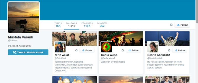 Varank; YPG’nin kadın birlikleri olan YPJ komutanı Nesrin Abdullah adına açılmış hesabın yanı sıra, hesabında “Önder Apo” diyen Gerîla Wêne isimli kullanıcıyı ve “İşgalci Türkiye Cumhuriyeti Terör Devleti” diyerek Abdullah Öcalan’a özgürlük çağrısında bulunan Zerin Welat isimli kullanıcıyı da takibe aldı.