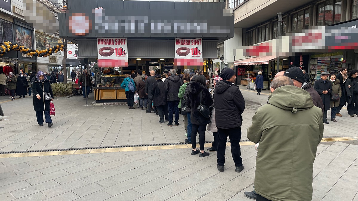 Ankara Kızılay’daki İzmir Caddesi üzerinde bulunan bir simit fırını 15 liralık simidi 10 liradan satışa sundu. Ucuz simidi gören vatandaşlar dükkan önünde kuyruk oluşturdu.