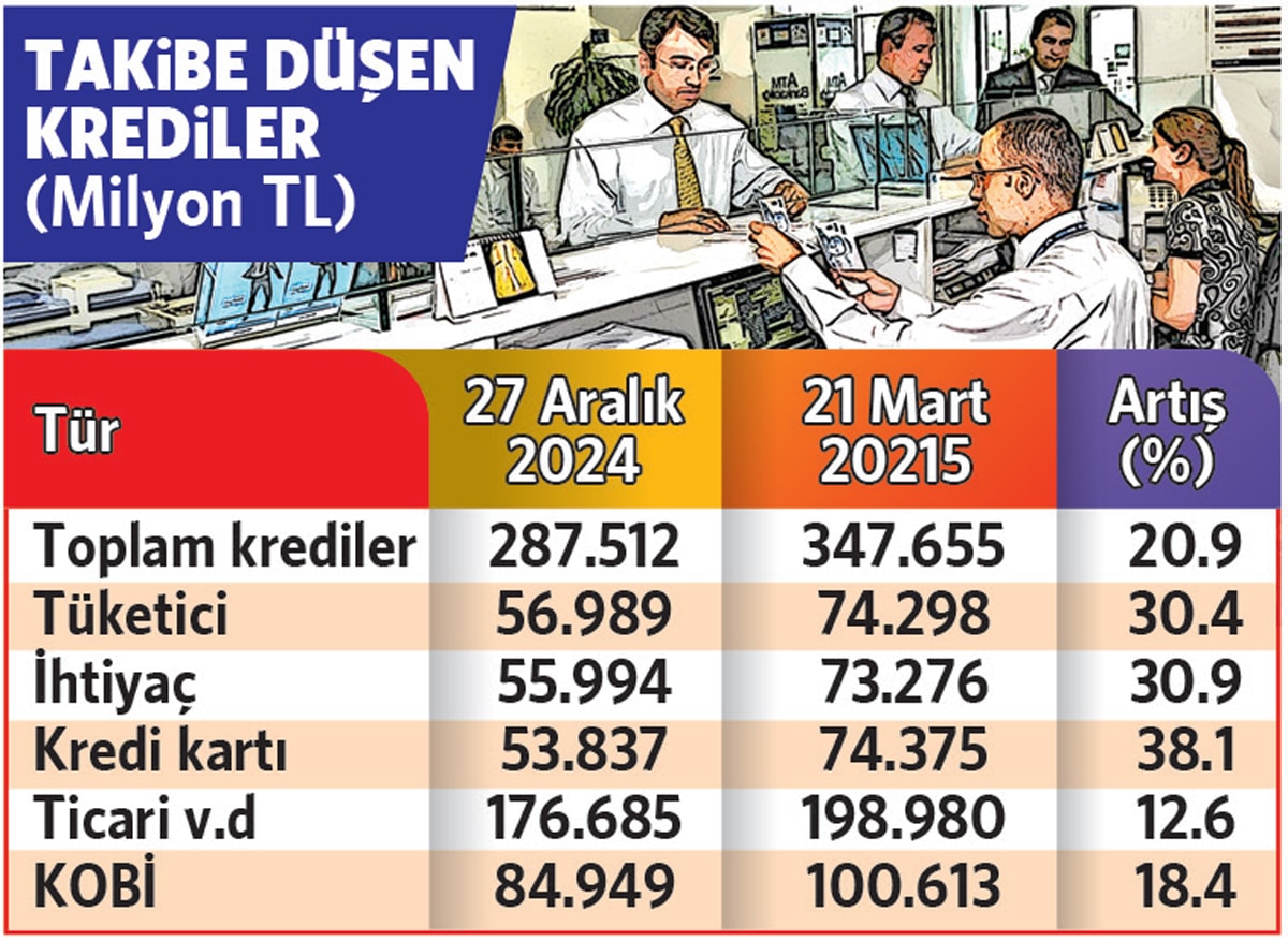 Üstelik bu artış kredi kullanım hızının da üzerine çıktı. Kredilerdeki takibe düşme oranı da geçen yılın sonuna göre taşıt kredileri hariç tüm kredilerde artış gösterdi.Bankacılık Düzenleme ve Denetleme Kurumu (BDDK) verilerine göre konut, taşıt ve ihtiyaç kredilerinden oluşan tüketici kredilerindeki toplam takibe düşen kredi miktarı yılbaşından bu yana yüzde 30.4 oranda artarak 57 milyar liradan 74.3 milyar liraya ulaştı. Batık kredinin tamamına yakınını ihtiyaç kredileri oluşturdu. Batık kredilerdeki artışa karşılık bankalardan çekilen bireysel tüketici kredisi miktarı ise 3 ayda yüzde 7.4 oldu.