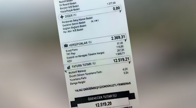 WhatsApp hattı'na gelen yoğun şikayetlerden biri de elektrik, doğalgaz ve su faturalarındaki fahiş fiyatlar. "Bu nasıl adalet" diye isyan eden bir okur elektrik faturasını yollamış. Faturada tüketim miktarın 5 bin 749 lira görünüyor. Ek ödemeler ve KDV ile birlikte fatura tutarı 12 bin 500 liraya yükselmiş.