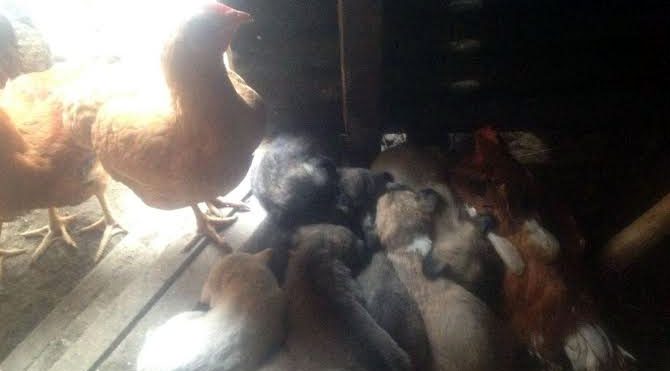 Balıkesir Bigadiç'ten bir okur hayvanların insanlara ders verdiği bir fotoğrafı paylaşmış. Söylediğine göre annesiz kalan yavru köpeklere tavuklar bakıyor.