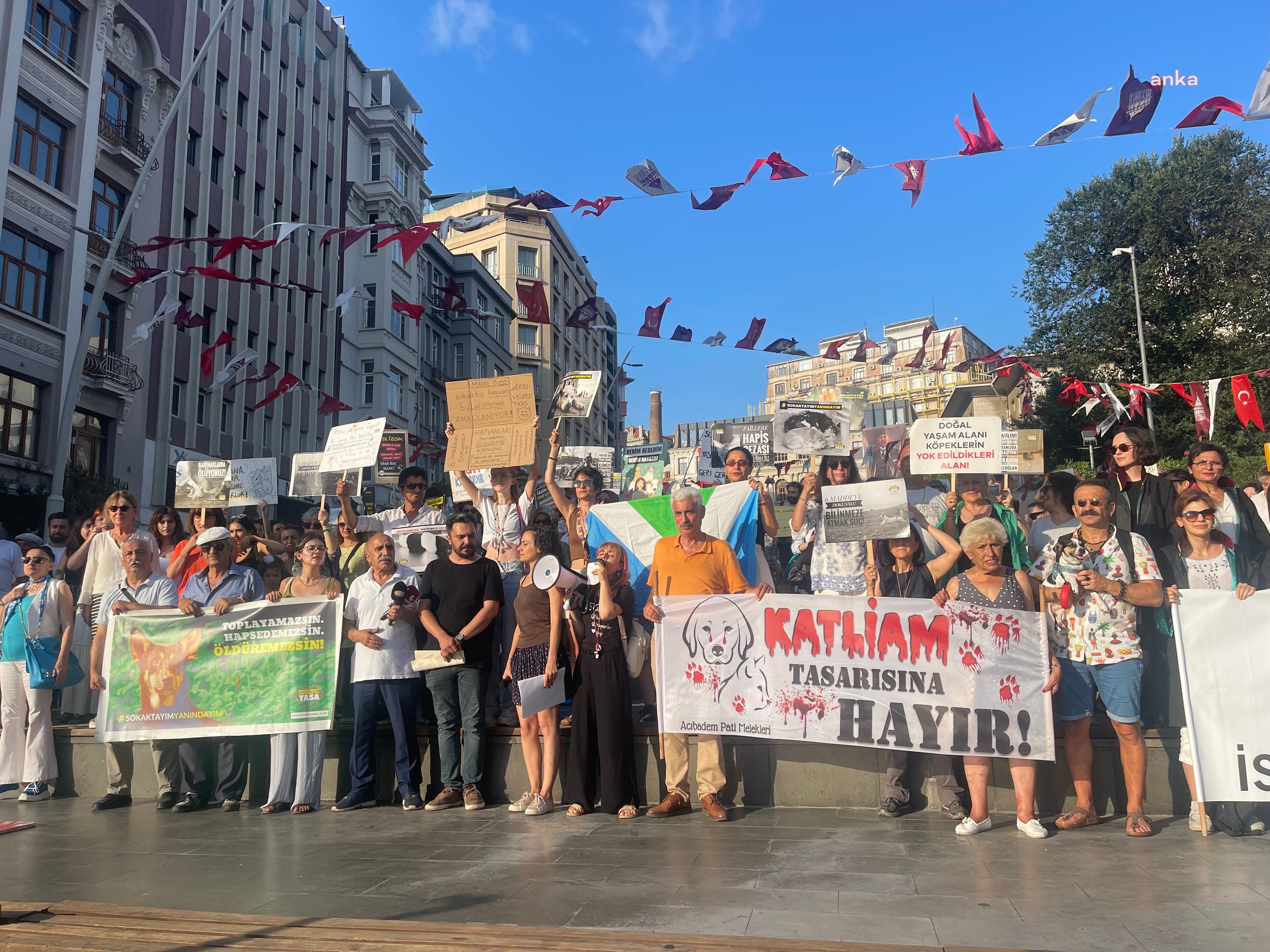 Yaşam İçin Yaşa ve Hayvan Yaşam Özgürlük inisiyatiflerinin çağrısıyla Beyoğlu Şişhane Meydanı’nda toplanan hayvanseverler, kamuoyunda ‘katliam yasası’ olarak bilinen sokak hayvanlarının uyutulmasını öngören yasa teklifini protesto etti.