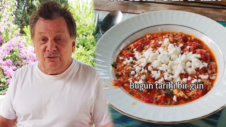 "Bugün tarihi bir gün. Eşim menemen yapmayı öğreniyor. Fatma Hanım yaptı. Soğanlı mı soğansız mı? Kuru soğan var, taze soğan var dereotu var, maydanoz var. Bir yumurta, bol domates. Ekmek yemiyoruz, modaya uyuyoruz. Yanında sağlıklı su da içiyoruz. Normalde bira da içilir."