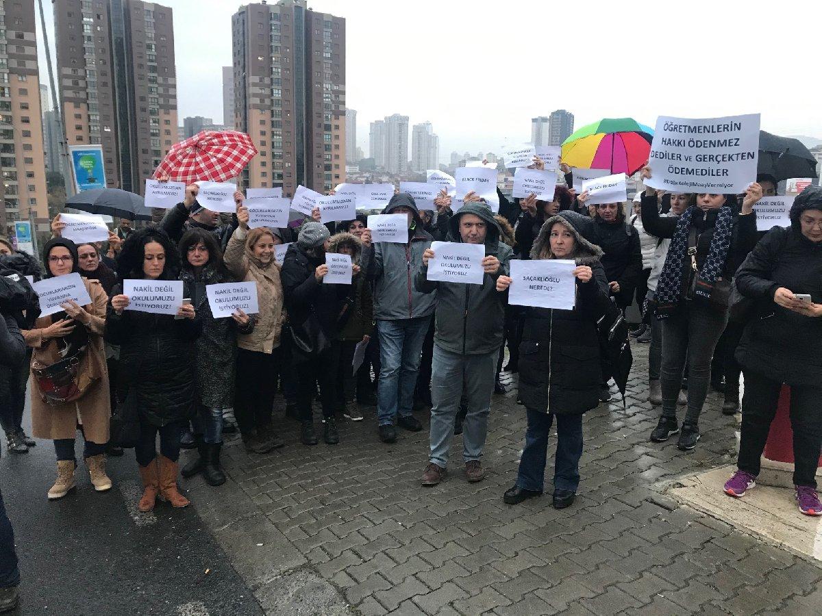 Ataşehir'de veliler ve öğrenciler Doğa Koleji'nin Genel Müdürlük binası önünde toplanarak öğretmenlerinin maaşlarının aylardır ödenmediği gerekçesiyle yağmurlu havaya aldırış etmeden eylem yaptı.