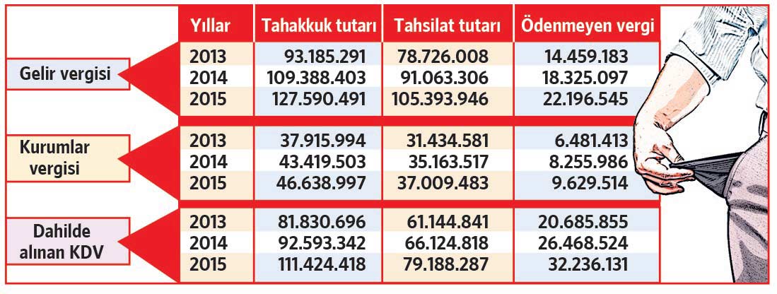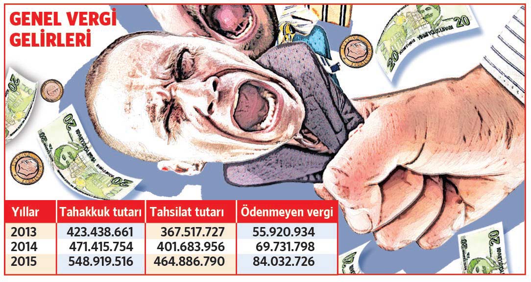 2015 yılı sonu itibarıyla devletin tahsil edemediği vergi alacağı tutarı 84.032.726 TL olup bunun 64.062.190 TL’lik bölümü ödenmeyen Gelir Vergisi, Kurumlar Vergisi ve dahilde alınan Katma Değer Vergisi’dir.