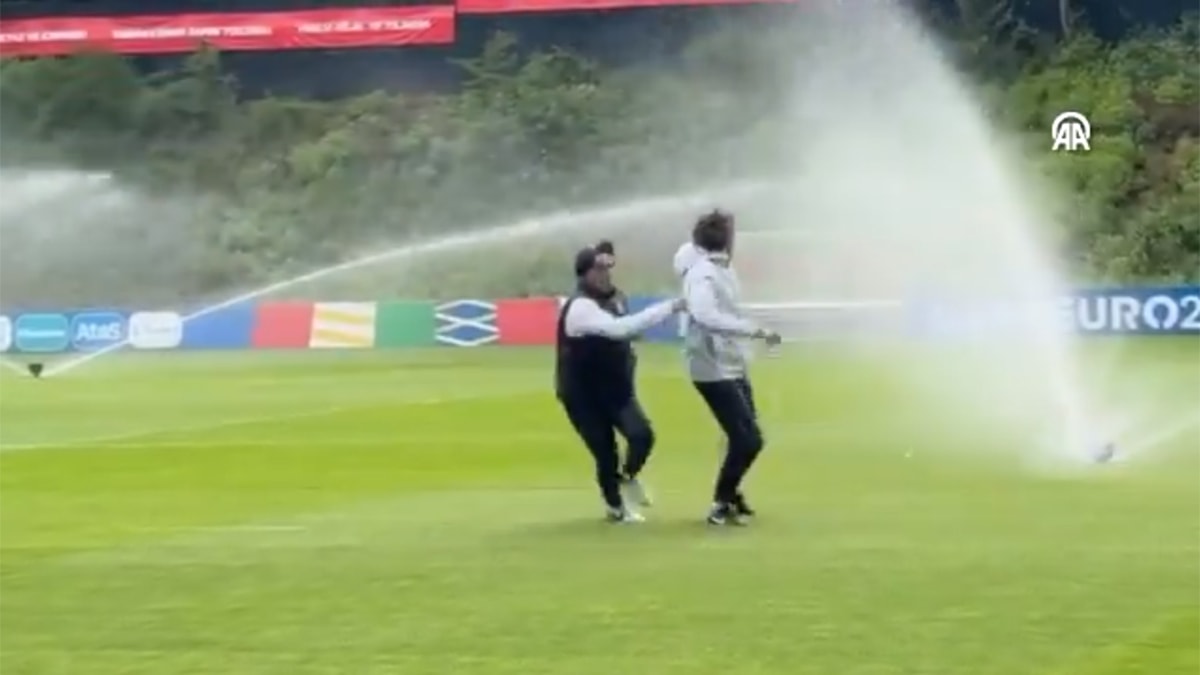 2024 Avrupa Futbol Şampiyonası (EURO 2024) hazırlıklarını Almanya'nın Hannover kentinde sürdüren A Milli Futbol Takımı'nın bugünkü antrenmanı için sahaya çıkan teknik direktör Vincenzo Montella'nın yeşil sahadaki fıskiyenin bir anda çalışmasıyla üzerine gelen basınçlı sudan ani bir vücut çalımıyla kurtulması kameralara yansıdı.