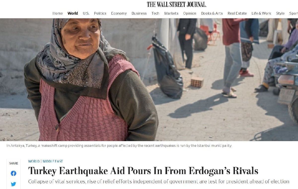 Wall Street Journal, İstanbul Büyükşehir Belediyesi'nin deprem bölgesindeki yardımlarda aktif rol aldığını yazdı.Millet İttifakı'nın cumhurbaşkanı adayı olarak lanse ettiği Ekrem İmamoğlu yönetimindeki İstanbul Büyükşehir Belediyesi'nden itfaiye ekipleri, polis, doktor ve gönüllülerin Hatay'da en görünen figürler olduğuna da dikkat çekildi. Wall Street Journal muhabiri, "Hayati devlet hizmetlerinin çökmesi ve hükümetten bağımsız yardım çalışmalarının artması yıllarca gücü merkezde toplamak isteyen Erdoğan için Mayıs ayında yapılacak seçimler öncesinde bir test oldu" dedi. Bölgede su ve elektrik gibi hayati hizmetlerin halen olmadığının belirtildiği haberde, gıda ve hijyen malzemeleri stoklarında da sıkıntılar olduğu belirtildi.