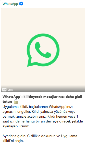 WhatsApp tarafından paylaşılan bilgilendirme mesajında, uygulama kilidi sayesinde mesajların daha gizli tutulabileceği vurgulandı. Yeni özellikle birlikte, telefonu başkalarının eline geçen kullanıcıların WhatsApp mesajlarına izinsiz erişiminin önüne geçilmesi amaçlanıyor.
