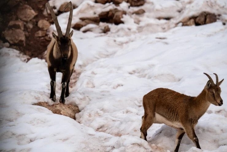 Adıyaman'da kar yağışının etkisi sürüyor. Kırsal bölgelerde yiyecek bulamayan yaban keçileri merkeze bağlı Koçali köyü yakınlarına indi.