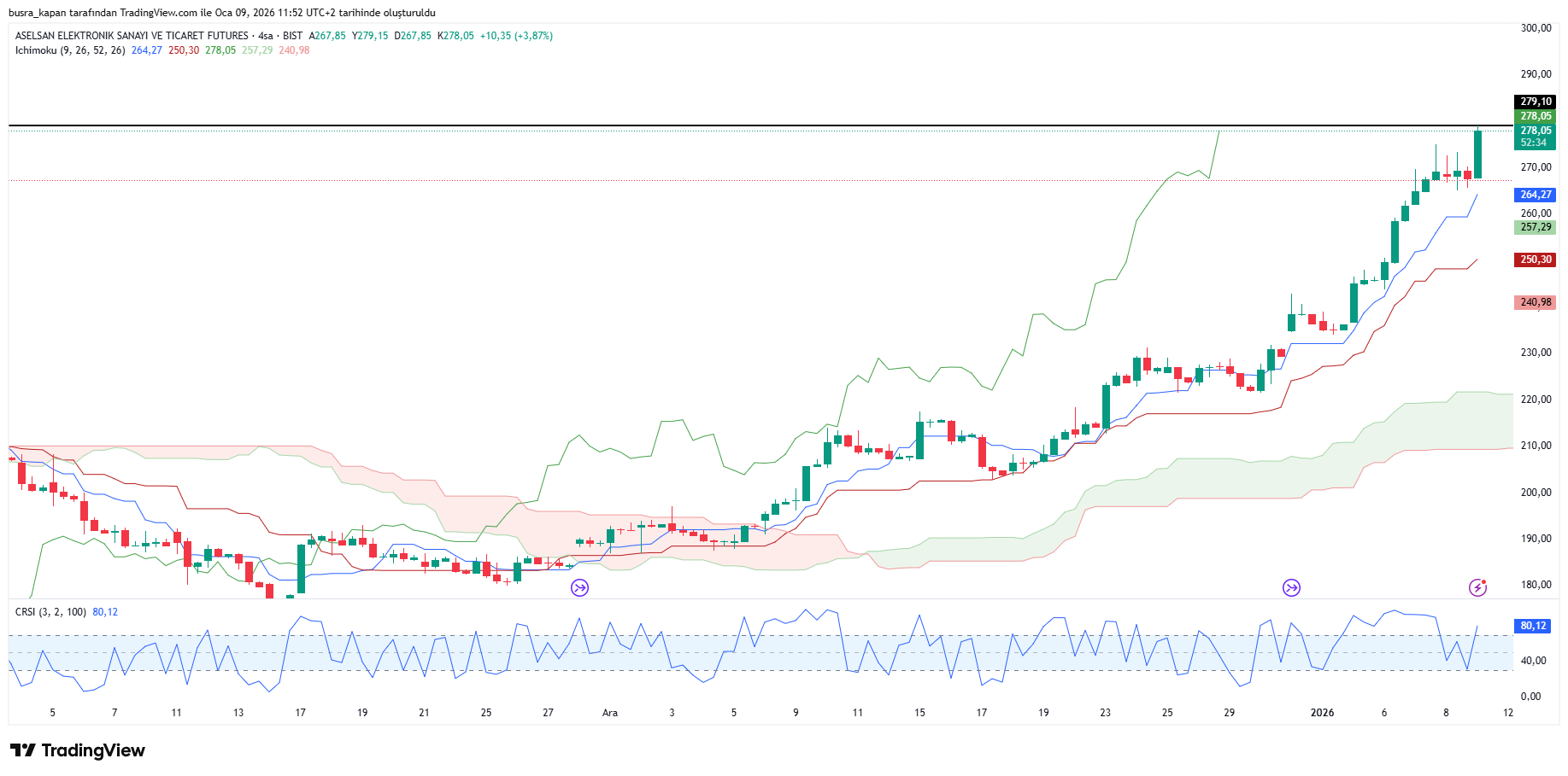 Aselsan hissesi haftanın son işlem gününe yükselişle başladı. Perşembe gününü 262,75 puandan kapatan Aselsan, yeni güne yükselişle başladı. Aselsan yeni günde 279,10 puana çıkarak yüzde 6'dan fazla değerlendi.