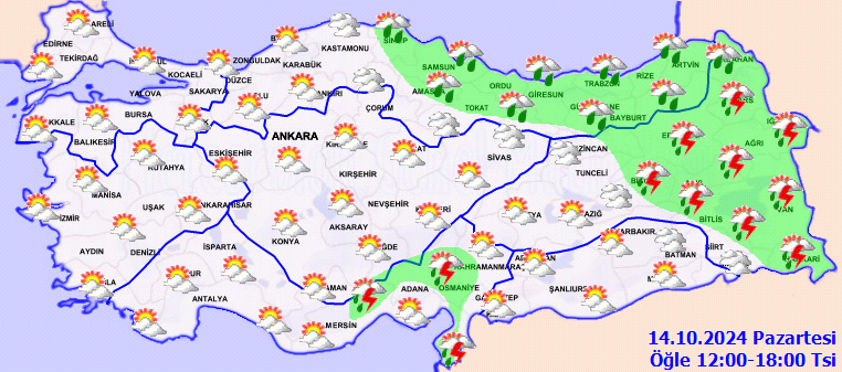 Meteoroloji, 14 Ekim hava durumu raporunu yayımladı. Rapora göre; Adana, Hatay, Mersin, Sinop, Amasya, Artvin, Samsun, Trabzon, Erzurum, Kars ve Van'da sağanak ve gök gürültülü sağanak bekleniyor.