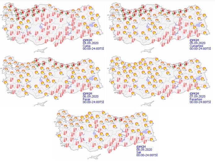 Meteoroloji Genel Müdürlüğü tarafından yapılan son değerlendirmelere göre; Ülkemizin kuzey kesimlerinin parçalı, yer yer çok bulutlu, Batı Karadeniz, Orta Karadeniz kıyıları, Kırklareli, İstanbul, Bursa, Yalova, Kocaeli, Sakarya, Bilecik, Giresun, Rize ile Edirne’nin kuzeyi, Tekirdağ’ın kuzey ve doğusu ile Eskişehir'in batısının yerel olmak üzere sağanak ve gök gürültülü sağanak yağışlı, diğer yerlerin az bulutlu ve açık geçeceği tahmin ediliyor.