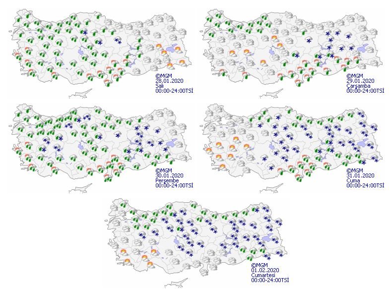 Yağışların genellikle yağmur ve sağanak, sabah ilk saatlerde Bolu'nun yüksek kesimlerinin, akşam saatlerinden sonra Batı Karadeniz'in iç kesimleri, Doğu Anadolu'nun batısı ile Tokat, Sivas ve Kayseri çevrelerinin yer yer karla karışık yağmur ve yükseklerinin kar yağışlı geçeceği tahmin ediliyor. Yağışların; Antalya'nın doğu ilçelerinde kuvvetli olması bekleniyor. Bu sabah ve gece saatlerinde iç ve doğu kesimlerde buzlanma ve don olayı ile birlikte yer yer pus ve sis hadisesi bekleniyor.