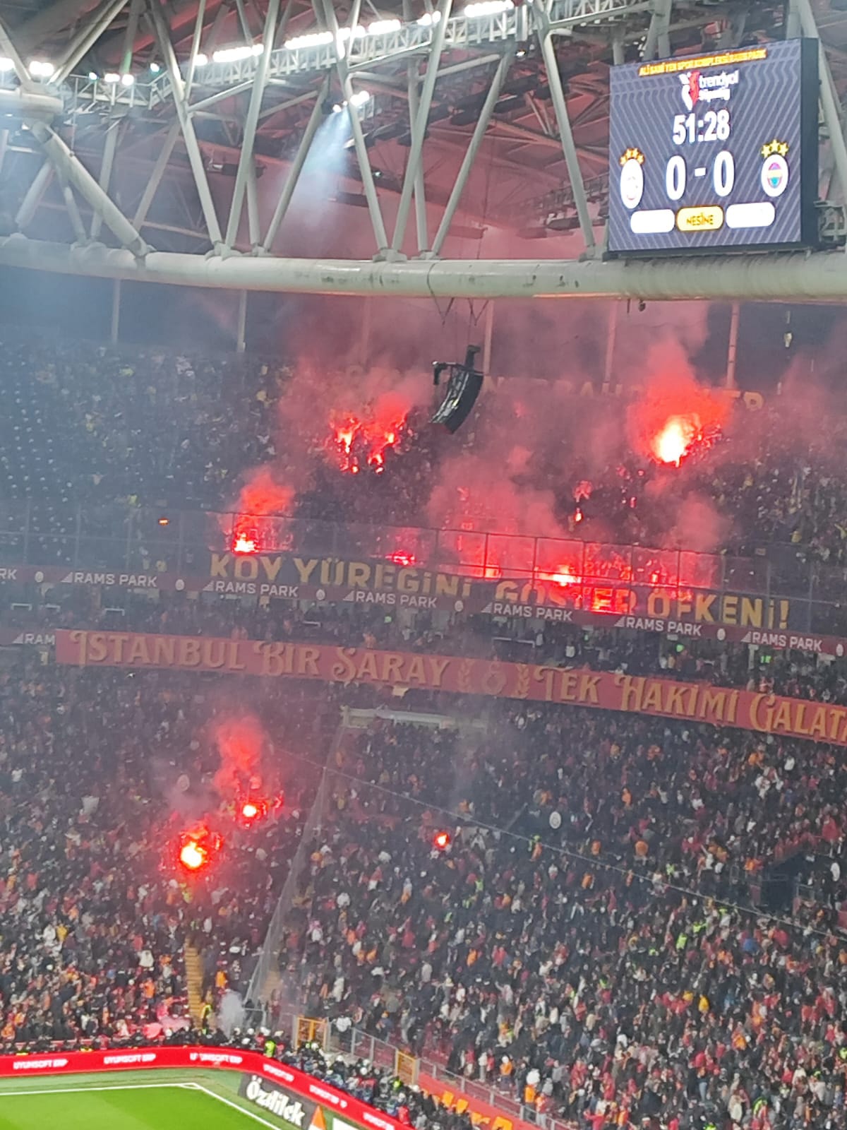 Meşaleler, alt tribünde yer alan Galatasaraylı taraftarların üzerine atıldı. Bazıları filelere takılıp kendi taraftarlarının üstüne düşerken birkaçı, engeli aşmayı başardı.