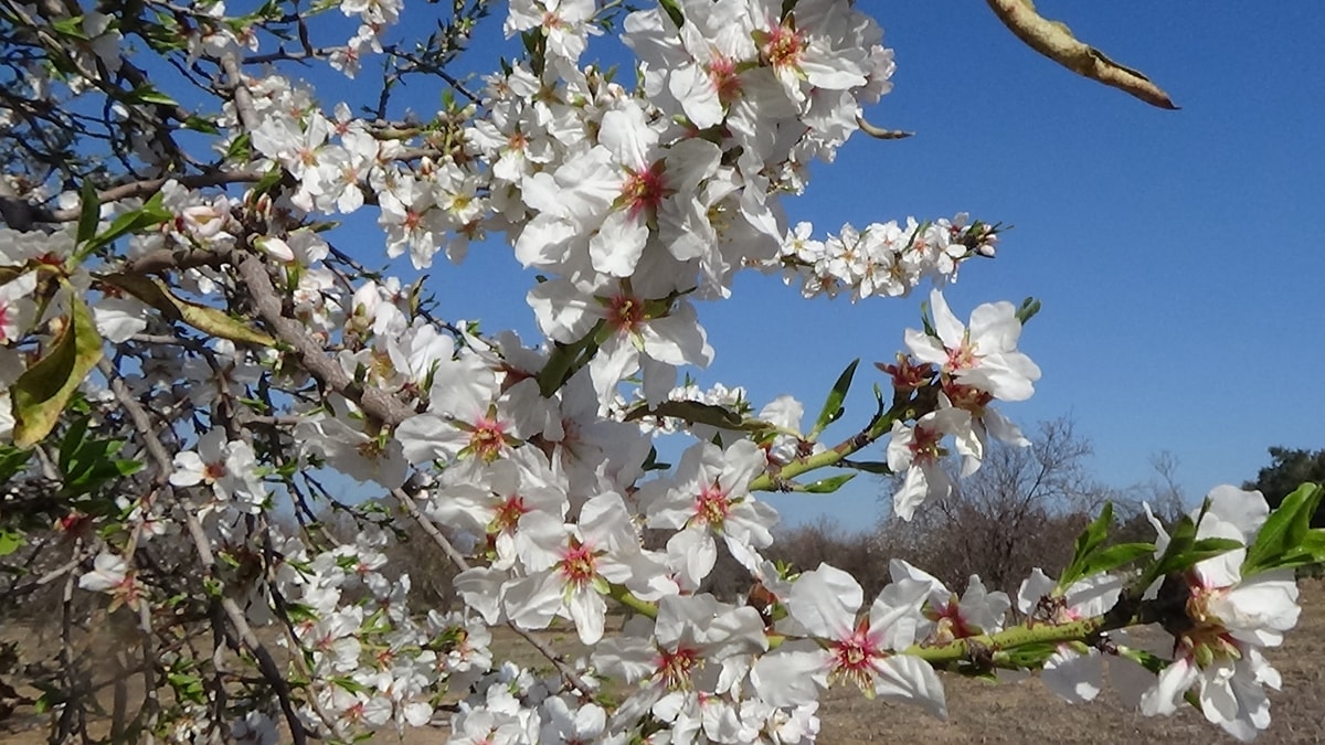 Hava sıcaklığının 20 dereceye ulaştığı ilçede, çiçeklerin açtığı badem ağaçları beyaza büründü.