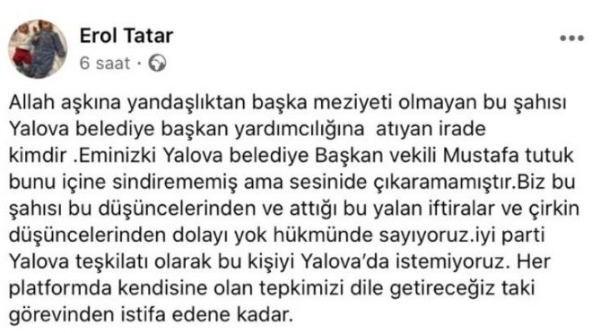* İyi Parti Yalova teşkilatı olarak bu kişiyi Yalova''da istemiyoruz. Her platformda kendisine olan tepkimizi dile getireceğiz görevinden istifa edene kadar.