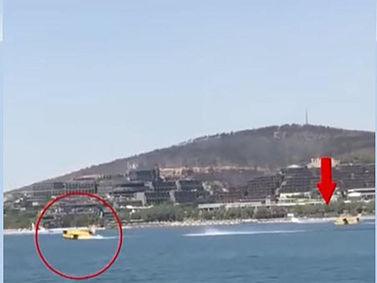 Avrupa'dan gelerek, yangınla mücadele eden söndürme uçağı, 5 Ağustos günü saat 14.00 sıralarında, Bodrum'un Güvercinlik Mahallesi önlerinde denizden su almak için alçaldı. Bu sırada söndürme uçağının önüne jet-ski geçti. Olası kazaya karşı için motorlarını durduran uçak, uzun süre kalkış yapamadı. Yangın söndürme uçağının denizden su almasını engellediği ileri sürülen jet-ski, çevredekiler tarafından cep telefonu kamerasıyla görüntülendi.