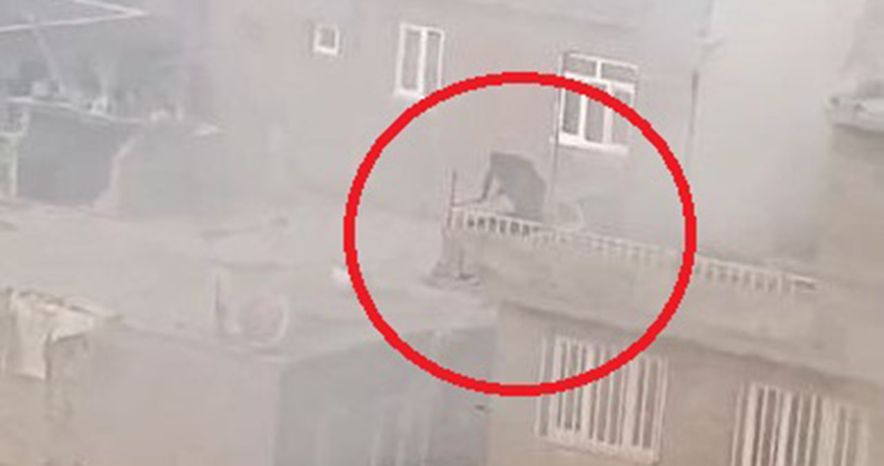 Yangın sırasında 3. kattaki dairesinde bulunan Özkan A. (44), dumandan etkilenmemek için kızları Tuana (11) ve Elifsu (7) ile birlikte balkona çıktı. O anlar, çevredekiler tarafından cep telefonuyla kaydedildi.