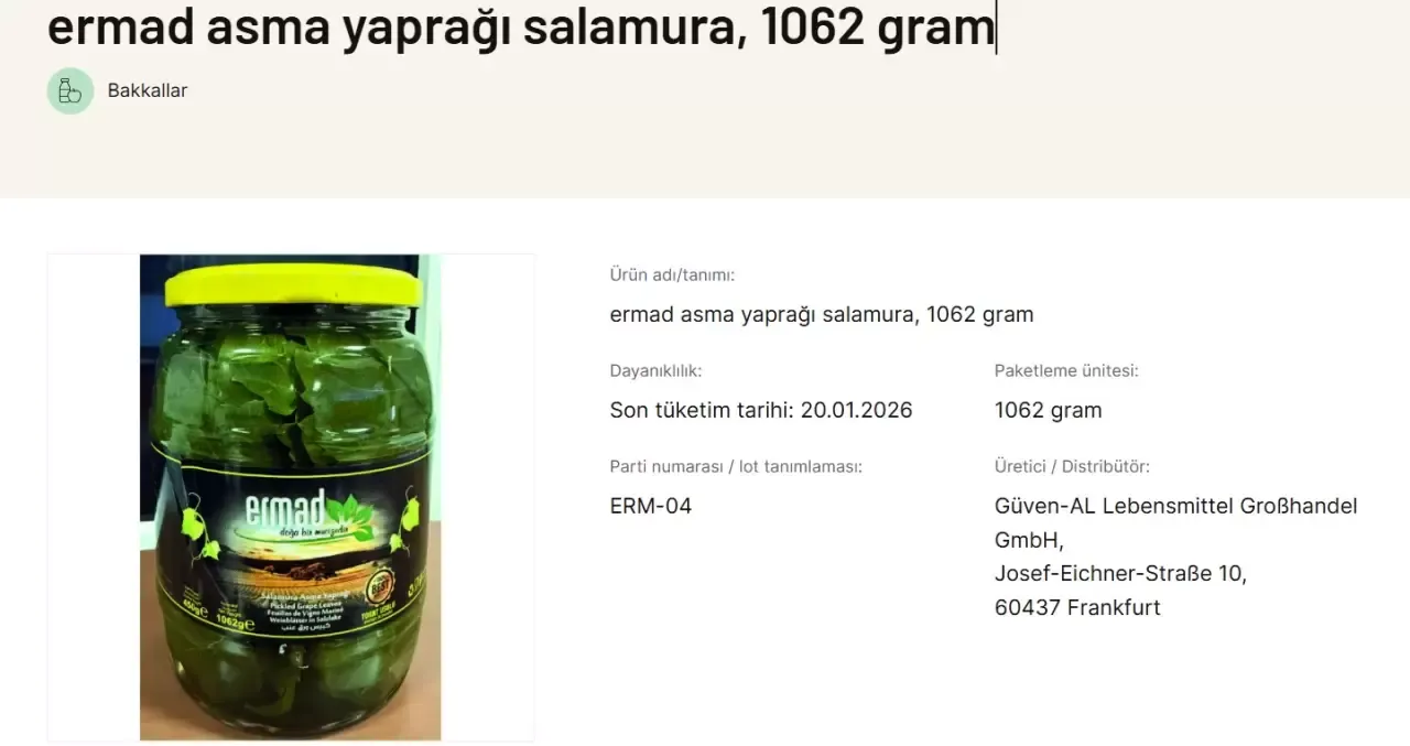 Manisa Ahmetli'de üretilen Ermad marka 1 kiloluk salamura üzüm yaprağına yönelik analizde, üründe pestisit kalınıtlarının saptanması üzerine, ürün için piyasadan geri çağırma; yani toplatma kararı veren ofis, birkaç gün sonra bir başka Türk markası için daha toplatma kararı aldı.