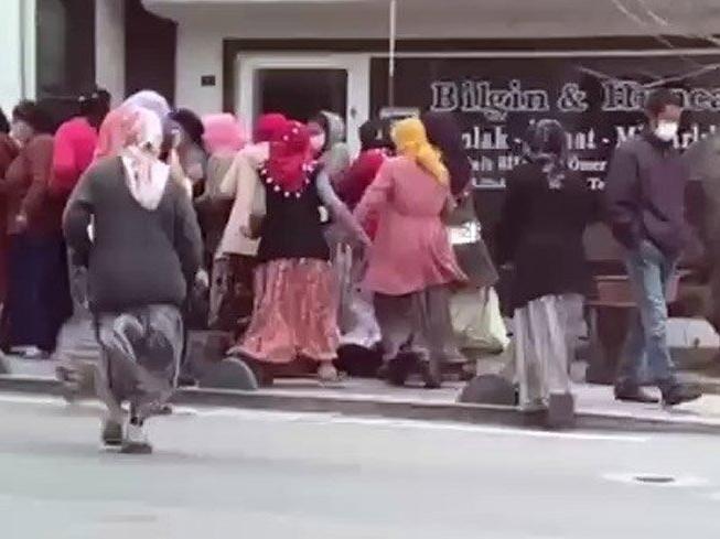 Görüntülerde evin önünde kadınların kalabalık oluşturması, sıraya girmeleri ve birbirlerini ittirmesi yer alıyor. (İHA)