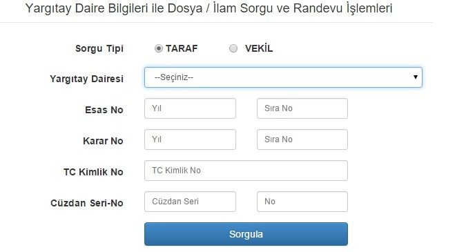 Bu ekranda kişiler ellerinde bulunan bilgilere göre seçim yapmalıdır. Yapılan seçimlere göre kişilerin dosya bilgilerine erişim sağlaması için farklı bilgiler istenir. Bu konuda örnek bir sorgulama sayfası ise şöyledir: