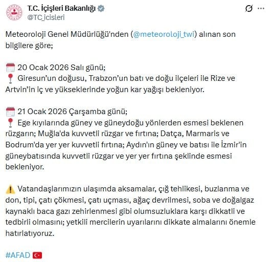 İçişleri Bakanlığı, Meteoroloji verileri doğrultusunda 20-21 Ocak tarihleri için kritik uyarı yayınladı.