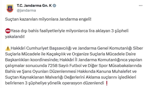 Jandarma Genel Komutanlığı’nın sosyal medya hesabından yapılan açıklamaya göre, Hakkari Cumhuriyet Başsavcılığı ile Jandarma Genel Komutanlığı koordinesinde, ‘Yasa dışı bahis’ ve ‘Suç gelirini aklama’ suçlarına yönelik operasyon gerçekleştirildi.