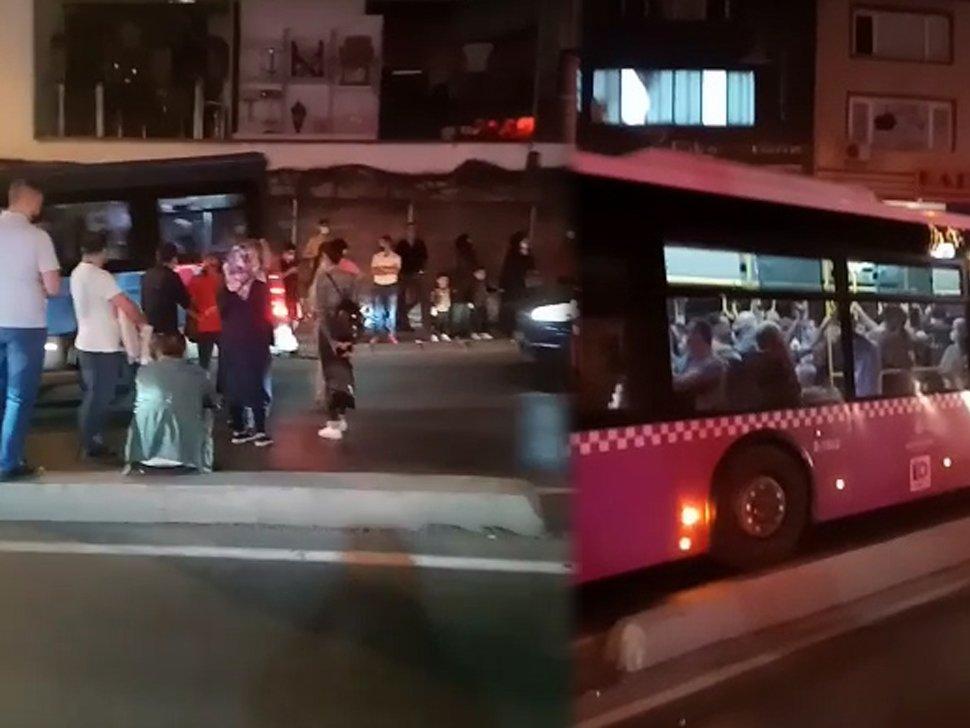 İstanbul Kağıthane'de salgın önlemleri nedeniyle otobüse ayakta binmesine izin verilmeyen yolcular, aracın önünü keserek trafiği kapattı.