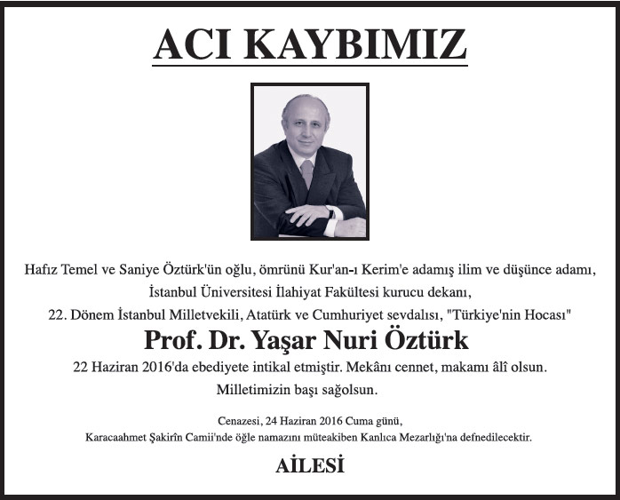 Öztürk ailesi Yaşar Nuri'nin ölümünün ardından gazetelere ilan verdi. İlanda şu ifadelere yer verildi " Hafız Temel ve Saniye Öztürk'ün oğlu, ömrünü Kur'an-ı Kerim'e adamış ve ilim ve düşünce adamı, İstanbul Üniversitesi İlahiyat Fakültesi kurucu dekanı, 22. Dönem İstanbul milletvekili, Atatürk ve Cumhuriyet sevdalısı, "Türkiye'nin HOcası" Prof.Dr. Yaşar Nuri Öztürk 22 Haziran 2016'da ebediyete intikal etmiştir. Mekanı cennet,makamı ali olsun. Milletimizin başı sağolsun.