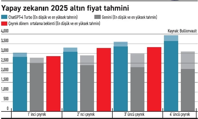 Bu modellerin yılsonu beklentileri de yukarı yönlü. Chat- GPT, ortalama altın fiyatının son çeyrekte 3.673--3.947 dolar bandına yükselebileceğini öngörüyor. Google Gemini ise daha temkinli bir tahminle son çeyrekte 3100 dolara işaret ediyor.