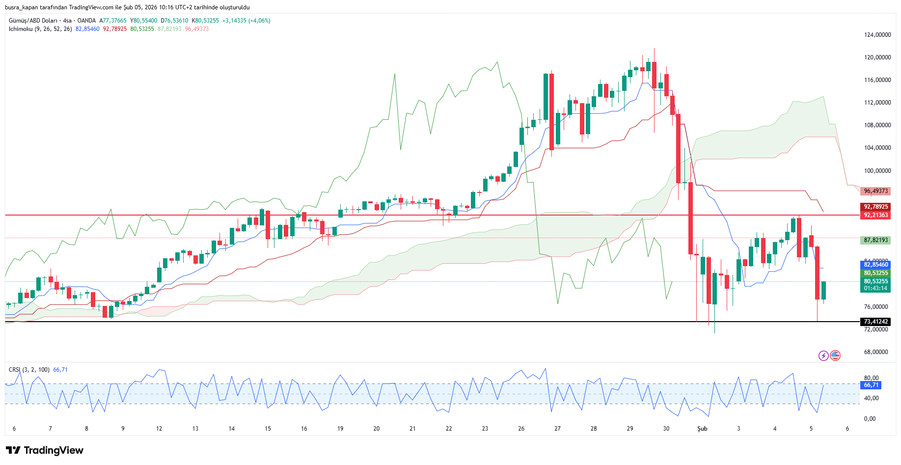 Gümüş fiyatları da aşağı yönlü eğilim sergiliyor. Ons gümüş, dün 92,21 doları gördükten sonra düşüşler başladı. Bu gece 04.00'te 73.41 dolara kadar geriledi. Bugün sabah saat 10.42'de 79.81 dolarda hareketleniyor.