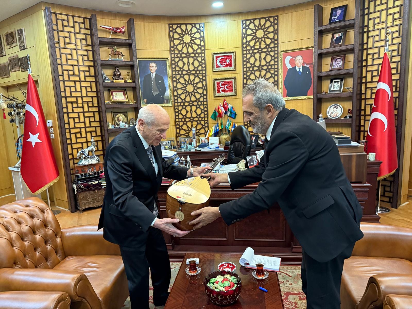Bingöl, buradaki ziyaret ettiği Devlet Bahçeli'ye bağlamayla 'Çeke Çeke' deyişini çalıp söyledi. Bingöl ardından bağlamasını Bahçeli'ye hediye etti.