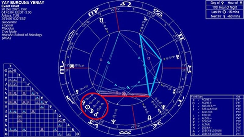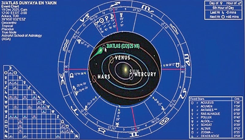 Uzun süredir konuşulan zamanlara vardık. 19 Aralık’ta 3I/ATLAS’ın Dünya’ya yakın geçişini (yaklaşık 270 milyon kilometre) deneyimleyeceğiz. Bir taraftan heyecanlı, bir taraftan da bir endişe vesilesi oldu son zamanlarda. Haliyle, en yakın geçişin astroloji haritasını değerlendirmek farz oldu. Yeniaydan bir gün önceye denk geldiği için Ay karanlık olacak. Venüs de Güneş’e yakın boylamda olduğu için göremeyeceğiz. Yani gökyüzü pek de ışıklı olmayacak. Mars, Venüs ve Merkür’ün dizilimde olacağı günlerde olacağız. Tüm bunların Satürn-Neptün ile dik açıda olacağı birkaç günlük sürece denk gelecek. Bu durumlar zaten çekim etkisi yaratır ve sismik aktivite artışına sebep olabilir.