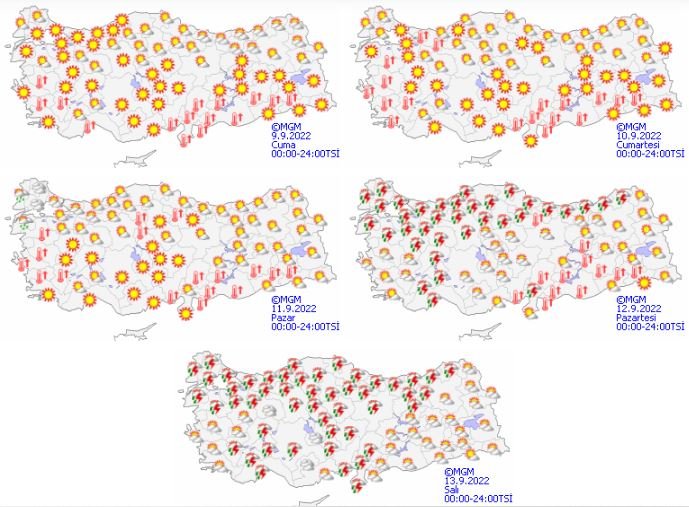 Meteoroloji Genel Müdürlüğü tarafından yapılan son değerlendirmelere göre: Ülkemizin kuzeydoğu kesimlerinin parçalı bulutlu, diğer yerlerin az bulutlu ve açık geçeceği tahmin ediliyor. Hava sıcaklıklarının kuzey, iç ve doğu kesimlerde 2 ila 4 derece artacağı, diğer yerlerde önemli bir değişiklik olmayacağı tahmin ediliyor.