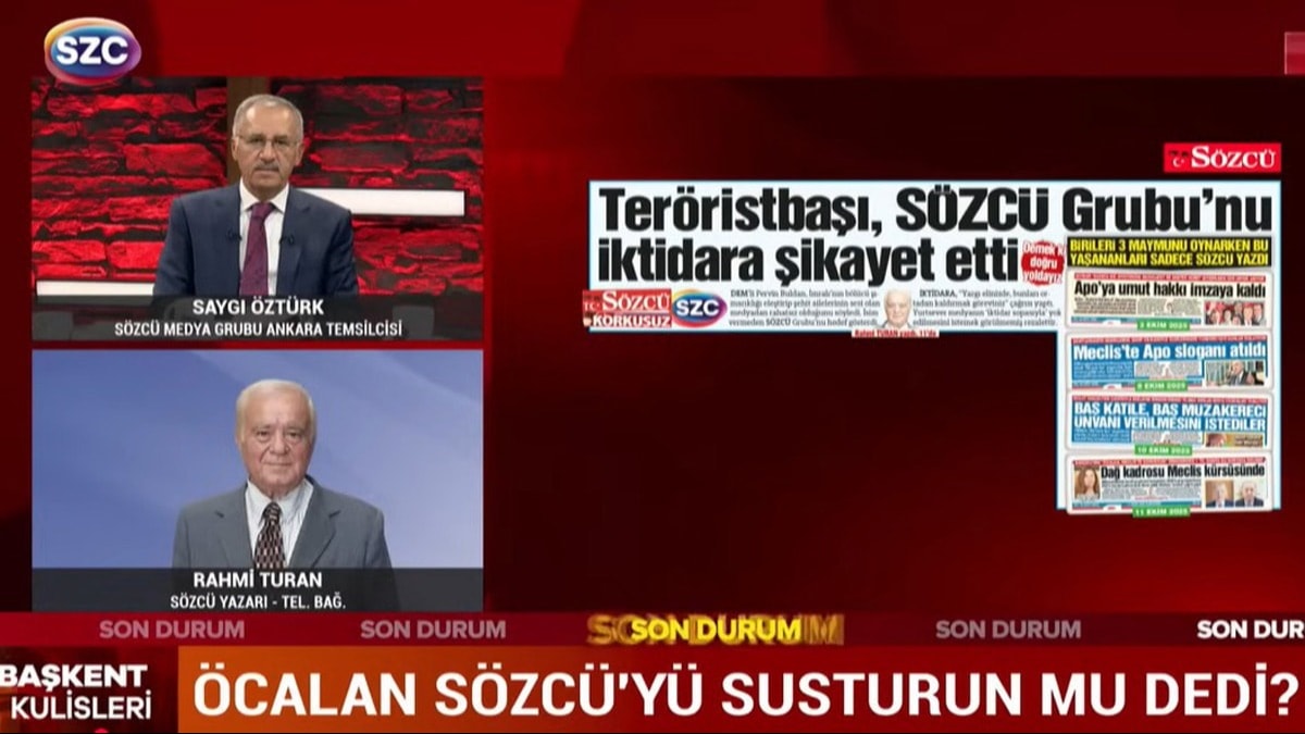 SÖZCÜ TV’de önceki gece Sözcü Ankara Temsilcisi Saygı Öztürk moderatörlüğünde yayınlanan Başkent Kulisleri programının konusu, SÖZCÜ Medya Grubu’na yönelik saldırılardı. DEM Partili Pervin Buldan “Öcalan medyanın dilinden rahatsız” demişti. Yazarımız Rahmi Turan, “Bu sözlerin hedefinde Sözcü Grubu geliyor. Sözcü, bağımsız, hiçbir holdinge bağlı olmayan kendi yağıyla kavrulan yayın kuruluşlarından biri. Bunları içeri atın filan mı demek istiyorlar, anlamadım. Kendilerine yakıştıramadım. Bu talep antidemokratiktir” dedi.