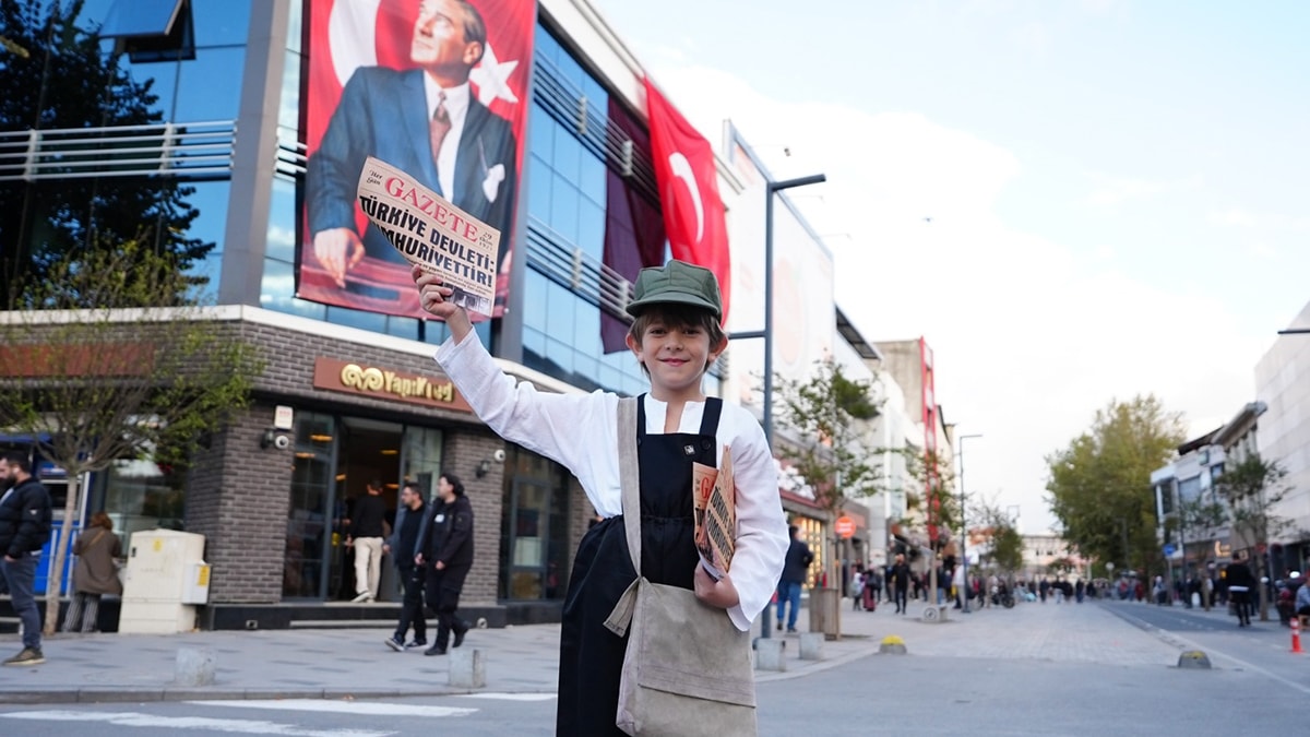 Bu kapsamda, küçük bir çocuk, Cumhuriyet’in ilan edildiği dönemindeki gazete dağıtıcısı çocuklar gibi giydirilerek, ‘Yazıyor, yazıyor. Cumhuriyet’in ilanını yazıyor’ sözleriyle, vatandaşlara üzerinde ‘Türkiye Devleti Cumhuriyettir’ yazılı gazete dağıttı.