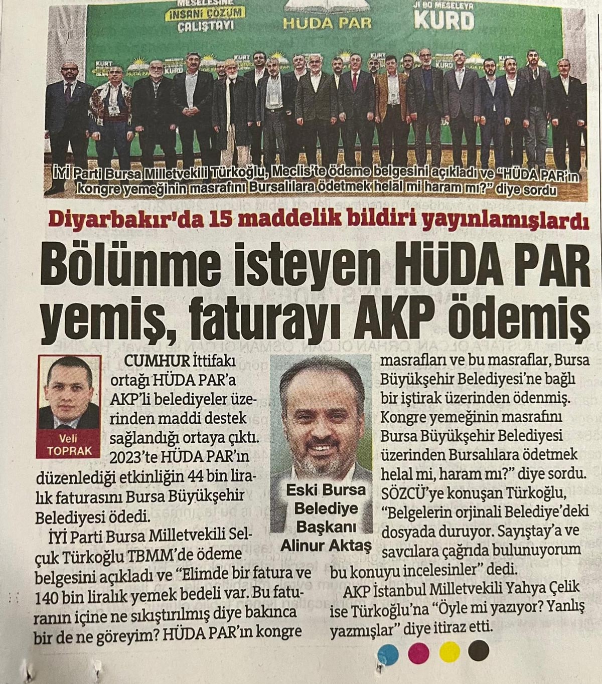 SÖZCÜ gazetesinin önceki gün sayfasına taşıdığı haberde, İYİ Parti Bursa Milletvekili Selçuk Türkoğlu’nun, Meclis’te bir HÜDA PAR için Bursa Büyükşehir Belediyesi’nin ödediği kongre yemeği yer almıştı. 44 bin TL’lik yemek faturasının Bursalılara ödetildiği belirtilmişti.