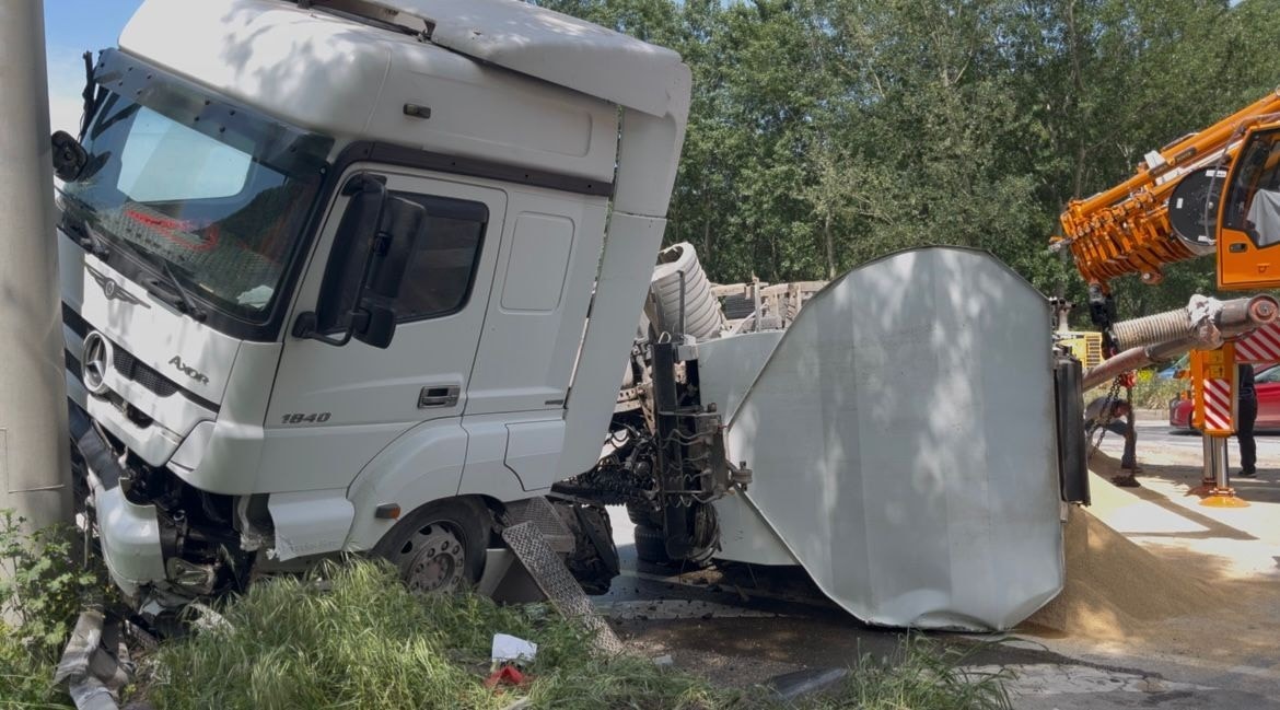 Adapazarı’ndan Pamukova’daki bir tavuk çiftliğine yem taşıyan İ.B. (47) yönetimindeki TIR, önünde seyreden hafif ticari araca arkadan çarptıktan sonra devrildi.
