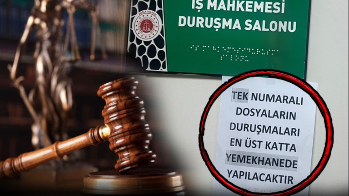 Binanın içerisine asılan yazıda, “Tek numaralı dosyaların duruşmaları en üst katta yemekhanede yapılacaktır” ifadesi yer aldı.