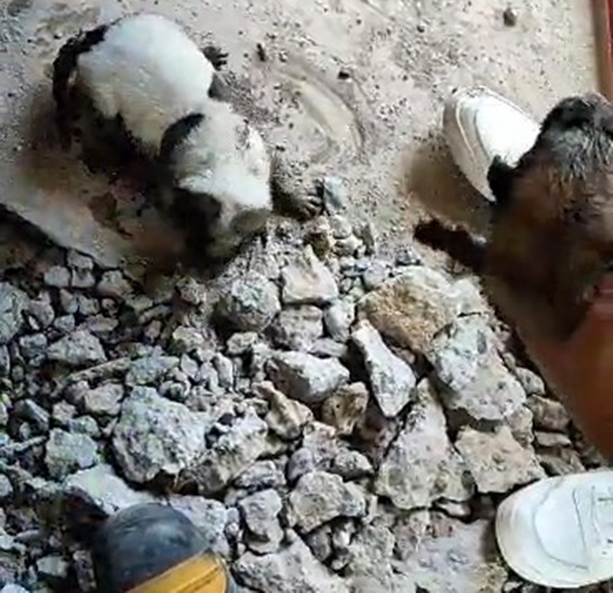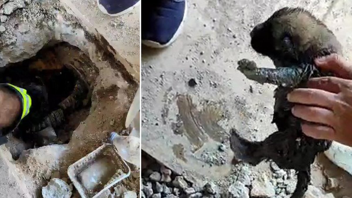 Kaldırımı kazan ekipler, 1 saatlik çalışmayla 4 yavru köpeğe ulaştı. Temizlenip ardından beslenen yavru köpekler, bir fırıncı tarafından sahiplenildi. (DHA)