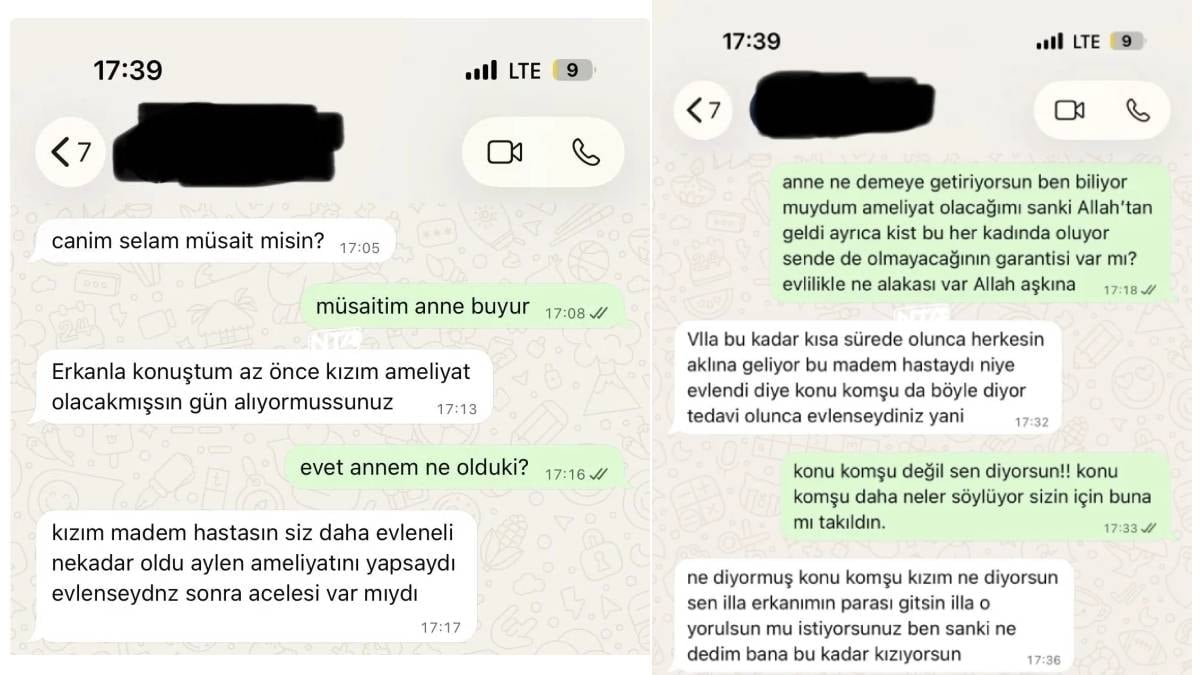 Genç bir kadın, ameliyat kararı sonrası kaynanası ile arasında geçen WhatsApp diyaloglarını kamuoyuyla paylaştı. Sosyal medyada hızla yayılan kayıtlarda, gelinin sağlık durumu ile evlilik süreci arasındaki ilişkinin sorgulanması ve maddi harcamalar üzerinden kurulan ifadeler dikkat çekti.