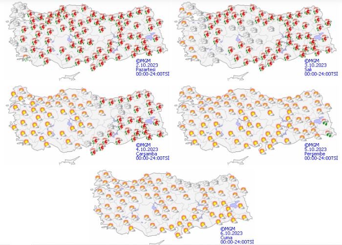 Meteoroloji Genel Müdürlüğü tarafından yapılan son değerlendirmelere göre: Ülkemiz genelinin parçalı ve çok bulutlu, Marmara'nın batısı ile Kıyı Ege dışında kalan yerlerin aralıklı sağanak ve gök gürültülü sağanak yağışlı geçeceği tahmin ediliyor. Marmara'nın doğusu, Batı Karadeniz kıyıları, Orta ve Doğu Karadeniz, İç Anadolu'nun güneydoğusu, Güneydoğu Anadolu'nun doğusu ve Doğu Anadolu'nun güneybatısında beklenen yağışların yer yer kuvvetli, Orta ve Doğu Karadeniz kıyılarında ise çok kuvvetli olacağı tahmin ediliyor.