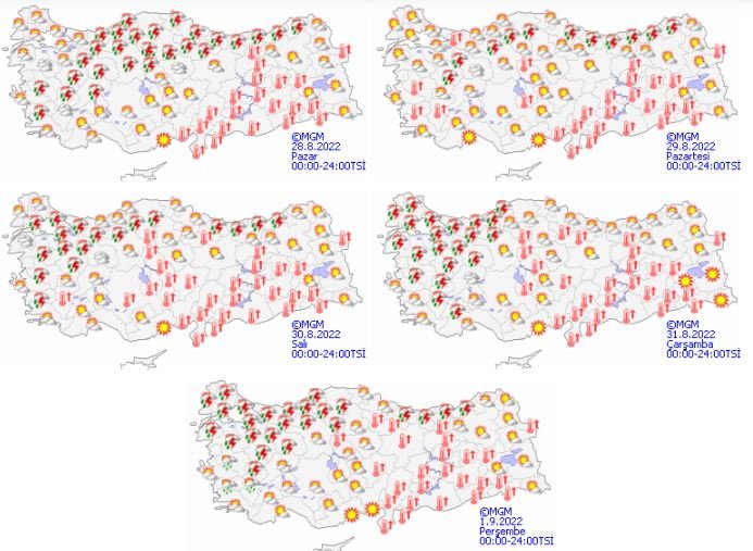 Meteoroloji Genel Müdürlüğü tarafından yapılan son değerlendirmelere göre: Ülkemizin kuzey ve batı kesimlerinin parçalı ve yer yer çok bulutlu, İç Ege (Denizli hariç), İç Anadolu’nun kuzeybatısı, Batı Karadeniz’in iç kesimleri, Orta Karadeniz, Doğu Karadeniz kıyıları, Sakarya, Bilecik ve Sinop çevreleri, Balıkesir’in güneyi, Antalya’nın batısının iç kesimleri ile Kastamonu’nun kıyı ilçelerinin yerel olmak üzere sağanak ve gök gürültülü sağanak yağışlı, diğer yerlerin az bulutlu ve açık geçeceği tahmin ediliyor.
