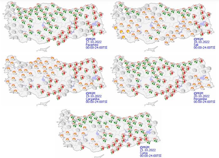 Meteoroloji Genel Müdürlüğü tarafından yapılan son değerlendirmelere göre: Ülkemiz genelinin parçalı ve çok bulutlu, Marmara'nın doğusu, Akdeniz (Antalya merkez ve Hatay hariç), İç Anadolu, Karadeniz, Doğu Anadolu (Bingöl ve Muş hariç) ile Kırklareli'nin kuzey kesimleri, Çanakkale'nin iç kesimleri, Balıkesir, İstanbul, Kütahya, Afyonkarahisar, Mardin, Batman ve Siirt çevrelerinin aralıklı sağanak ve yer yer gök gürültülü sağanak yağışlı geçeceği tahmin ediliyor.